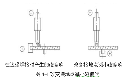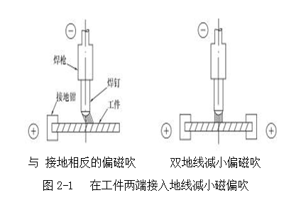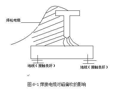 接地端在生產(chǎn)過程中總是預(yù)先接好,在焊接過程中,由于工件慢慢被磁化,將發(fā)生電弧向接入端的另一面偏移。此時(shí)應(yīng)盡早接入另一根規(guī)格相同的地線,長度相同,以防止工件被磁化而發(fā)生磁偏吹。如下圖2-1所示: