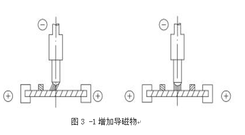 因?yàn)橘|(zhì)量較大的一面將會(huì)被更大強(qiáng)度地磁化,從而對(duì)電弧產(chǎn)生引力,當(dāng)發(fā)生這一現(xiàn)象時(shí),應(yīng)從結(jié)構(gòu)上進(jìn)行修正,在無法避免的情況下,焊接時(shí)應(yīng)適當(dāng)增加導(dǎo)磁物,加入導(dǎo)磁物的目的是吸引電弧。通常將導(dǎo)磁物加工成半圓形,厚度與重量根據(jù)實(shí)際情況調(diào)整。如圖3-1所示: